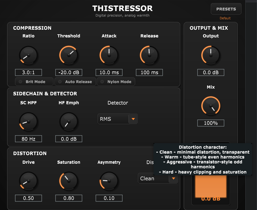Internally, Thistressor runs clean parallel compression with a dedicated sidechain path: