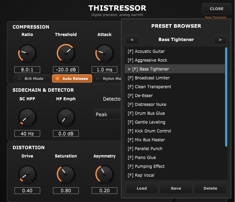 Thistressor ships with 20 factory presets, designed for real-world use: